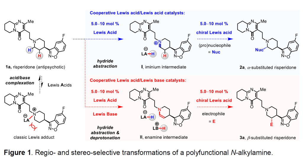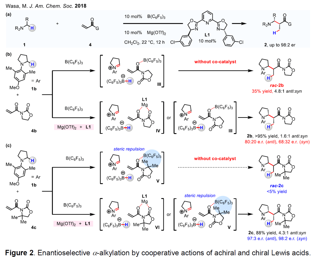 We have developed a method for the enantioselective union of various N-alkylamines (1) and α, β-unsaturated compounds (4) by implementing the cooperative action of two untethered and independently operational Lewis acid catalysts (Figure 2). 13 One key advantage of the approach would be that efficiency and stereoselectivity might be optimized through evaluation of pairs of readily accessible Lewis acids and chiral ligands (vs bifunctional catalysts needing cumbersome tethering of the catalyst units). 1-3 A central design principle is that the untethered Lewis acid catalysts must perform their separate tasks without any overlapping of their function, as otherwise, stereoselectivity would suffer (owing to reaction facilitated by the achiral component). 1-3 Specifically, we illustrated that by properly tuning the structural and electronic features of different Lewis acids and substrates, the ability of B(C 6 F 5 ) 3 and chiral (TfO) 2 Mg/L1 to serve as a hydride acceptor from 1, or an activator of 4, can be adjusted. We found out that the racemic C–C bond forming reaction of 1b and 4b can be catalyzed by B(C 6 F 5 ) 3 alone (1b and 4b → III → rac–2b, Figure 2b). As a result of this competing racemic process, 2b can be obtained with only up to 80:20 er when the union of 1b and 4b is catalyzed by B(C 6 F 5 ) 3 and (TfO) 2 Mg/L1(2b is formed via either III → rac–2b or IV → 2b). To improve enantioselectivity further, we reacted1b with a more sterically hindered electrophile 4c (vs 4b), which resulted in the formation of 2c in up to 98:2 er (Figure 2c). The improved enantioselectivity likely arises from a preference for Mg-activated VI over (F 5 C 6 ) 3 B-activated V, the latter of which suffers from severe steric pressure between the gem-dimethyl group of 4c and B(C 6 F 5 ) 3 . This contention is supported by the fact that 1b and 4c do not react in the absence of (TfO) 2 Mg/L1. The principles delineated by our work later served as the conceptual framework for the development of new processes that demand separate and independently operational Lewis acidic co-catalysts whose functions overlap and the use of which initially seems to have a negative impact on enantioselectivity.