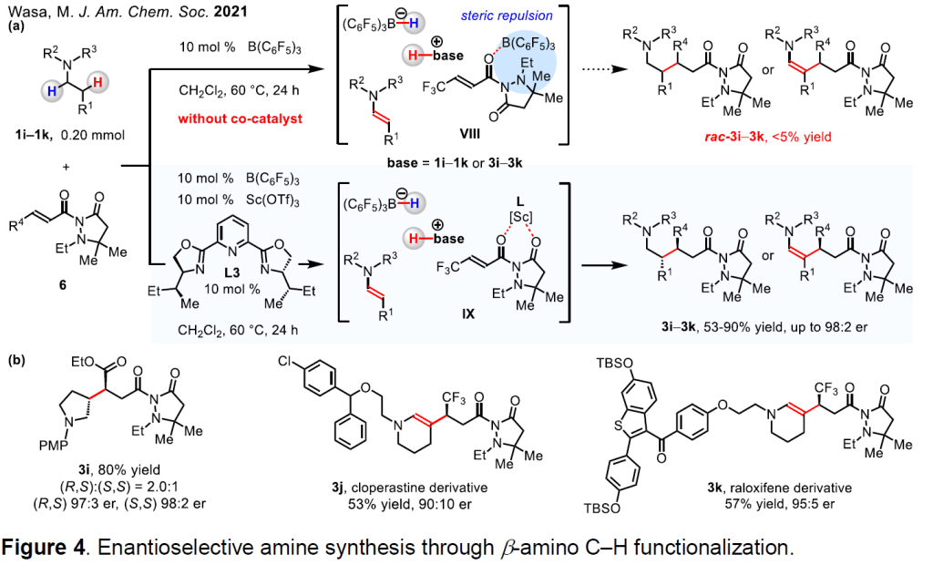 The development of methods for enantioselective synthesis amines by activation of the difficult-to-access β-amino C–H bond is a major and unresolved challenge. 15 α-Amino C–H activation by hydrogen atom or hydride transfer is facilitated by the stabilization of the resulting species through electron delocalization from the nitrogen lone pair (e.g., amine → iminium ion). 15 Still, such processes do not readily occur at the β position of amines. We have discovered that a potent catalyst system comprised of B(C 6 F 5 ) 3 , a chiral Sc-based co-catalyst, and a Brønsted base promotes enantio- and diastereo-selective reactions of N-alkylamines (e.g., 1i–1k) and α, β-unsaturated compounds (6) to give β-alkylated amines (3i–3k). 16 Our mechanistic studies have unveiled that B(C 6 F 5 ) 3 and the Brønsted base (e.g., amines 1 and/or 3) convert 1 into an enamine via sequential hydride abstraction and deprotonation (1 → VIII or 1 → IX). We have found that B(C 6 F 5 ) 3 alone is incapable of promoting the union of 1 and 6 to afford racemic products (VIII → rac-3i–3k). However, in the presence of the Sc-based complex, C–C bond formation occurs smoothly (IX → 3i–3k). A variety of Lewis acid-sensitive functional units are tolerated, and, as a result, the approach is applicable to late-stage modification of relatively complex (and bioactive) trialkylamines (e.g., 3j and 3k).