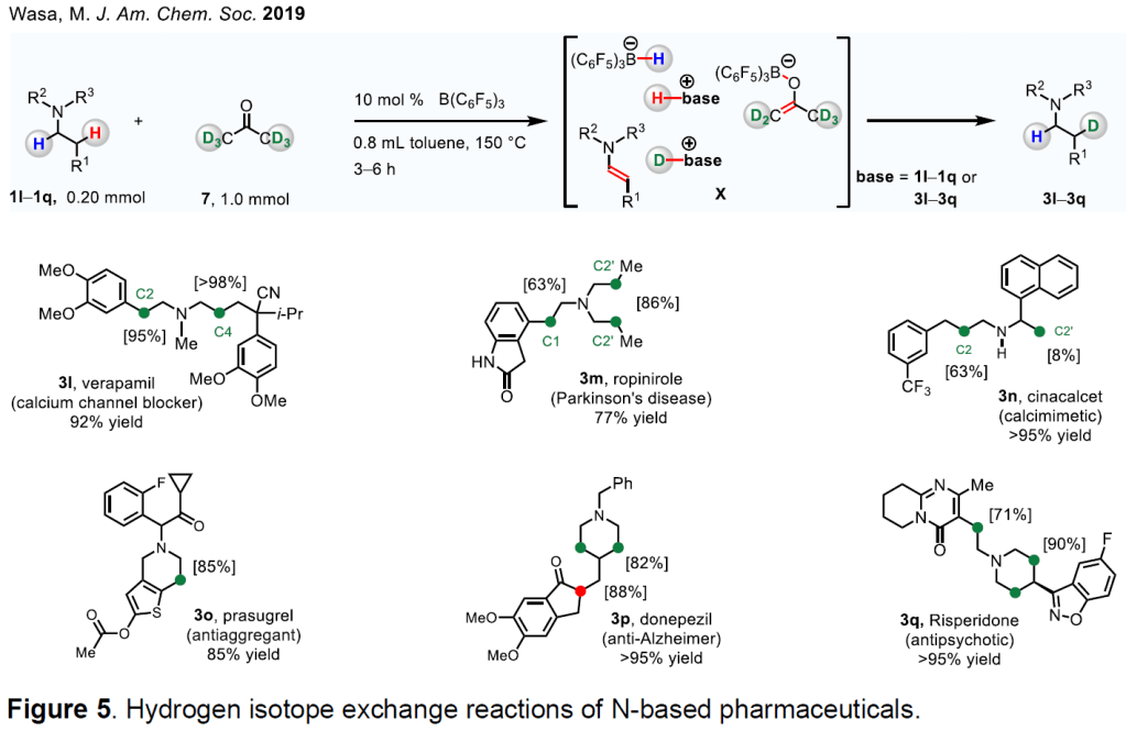 We have designed a method for site-selective deuterium labeling of β-amino C–H bonds in bioactive amines (Figure 5). 17 By implementing the cooperative action of B(C 6 F 5 ) 3 and amine, we have illustrated that the N-alkylamine-based drugs containing different functional groups can be converted into the corresponding enamine (1l–1q → X), and that the same catalyst system can generate a labeling agent from acetone-d 6 by removal of deuterium (7 → X). The ensuing reaction of the enamine and deuterating reagent affords the drug isotopologues (e.g., 3l–3q).