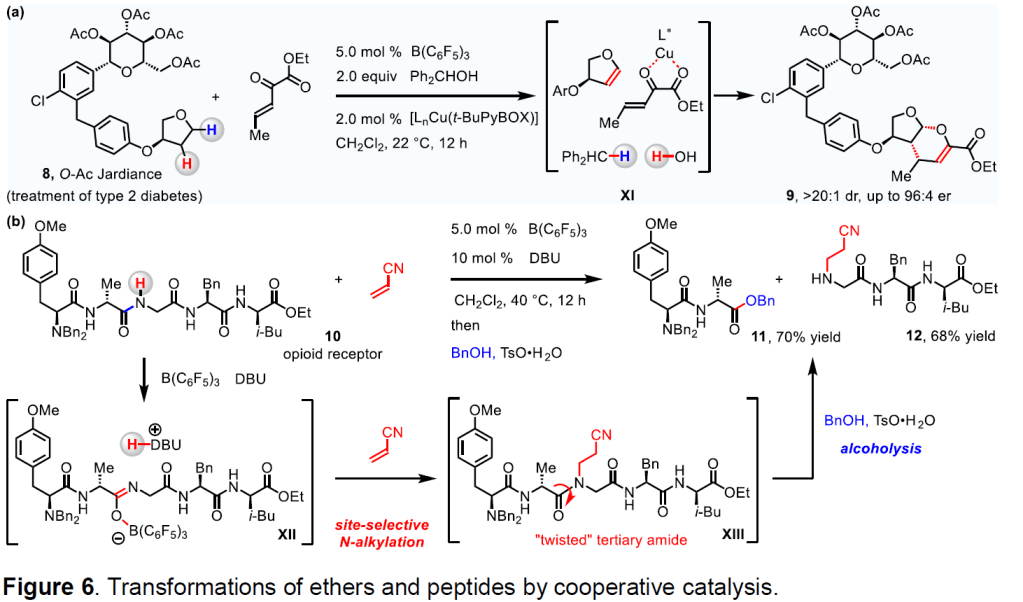 We are engaged in the development of enantioselective reactions of vinyl ethers formed by C–H activation of an ether moiety (Figure 6a). A cation, formed by the reaction of B(C 6 F 5 ) 3 and an alcohol, abstracts a hydride from the ether substrates to afford oxocarbenium ions that may be deprotonated to furnish vinyl ethers (e.g., 8 → XI). A chiral Cu-based co-catalyst promotes the stereoselective inverse electron demand Diels-Alder reaction between ethyl 2-oxopent-3-enoate and the vinyl ether (XI → 9). The stereoselective merger of ethers and various coupling partners is expected to be highly applicable to complex carbohydrate and natural product syntheses.